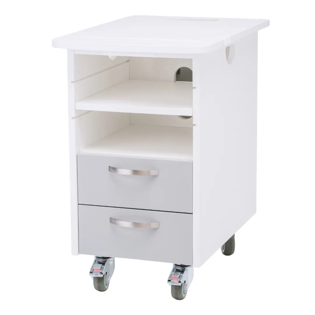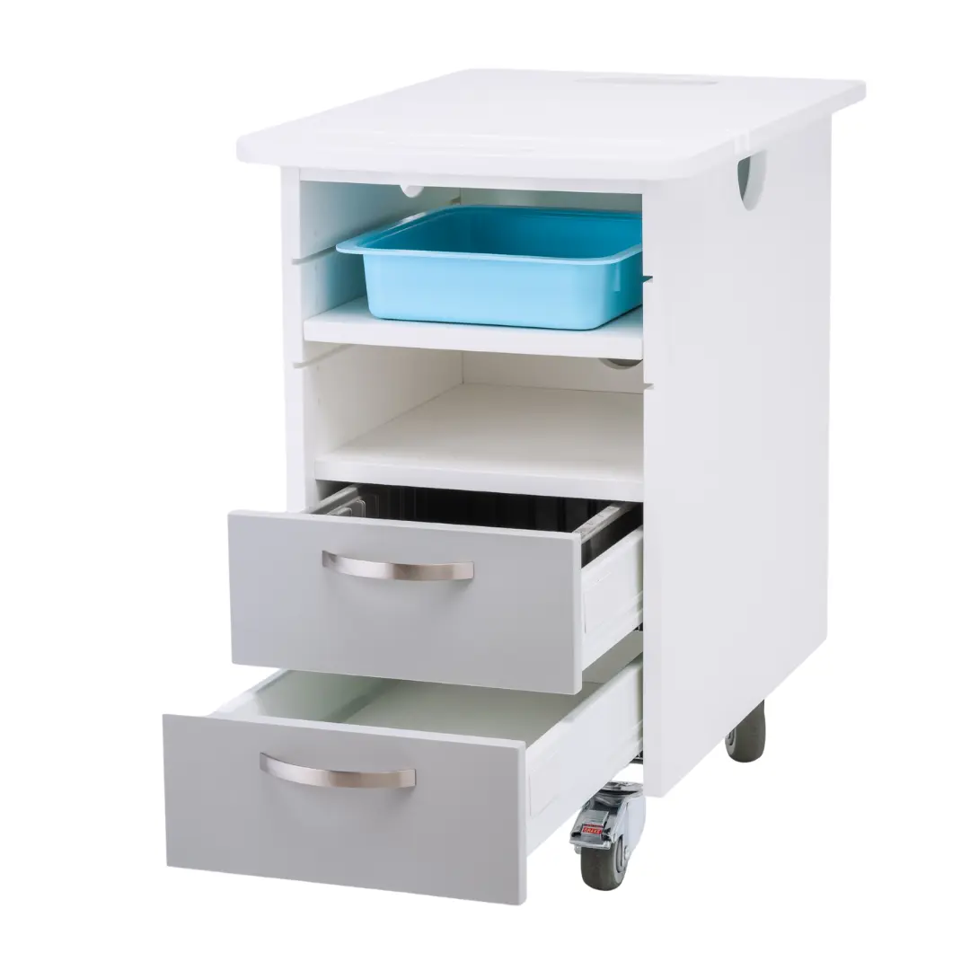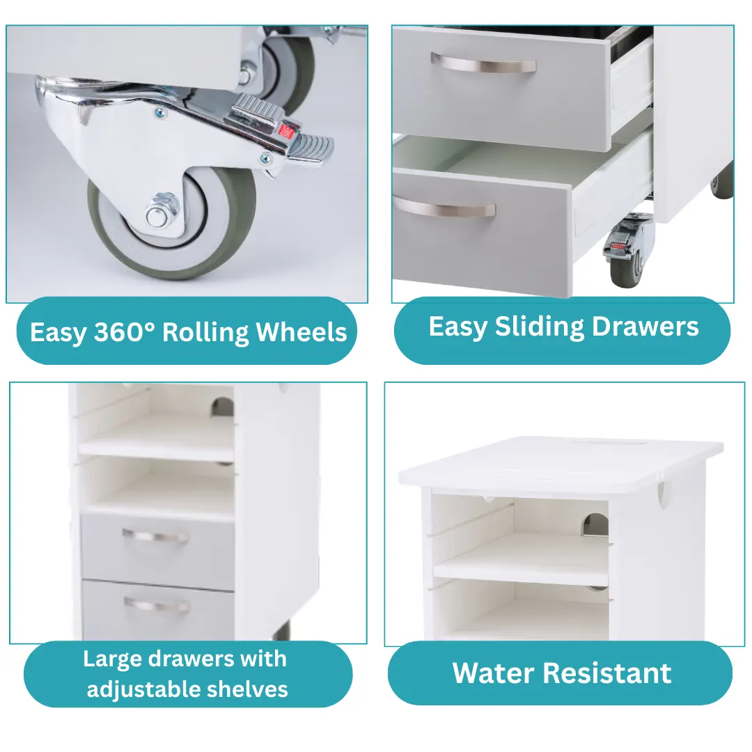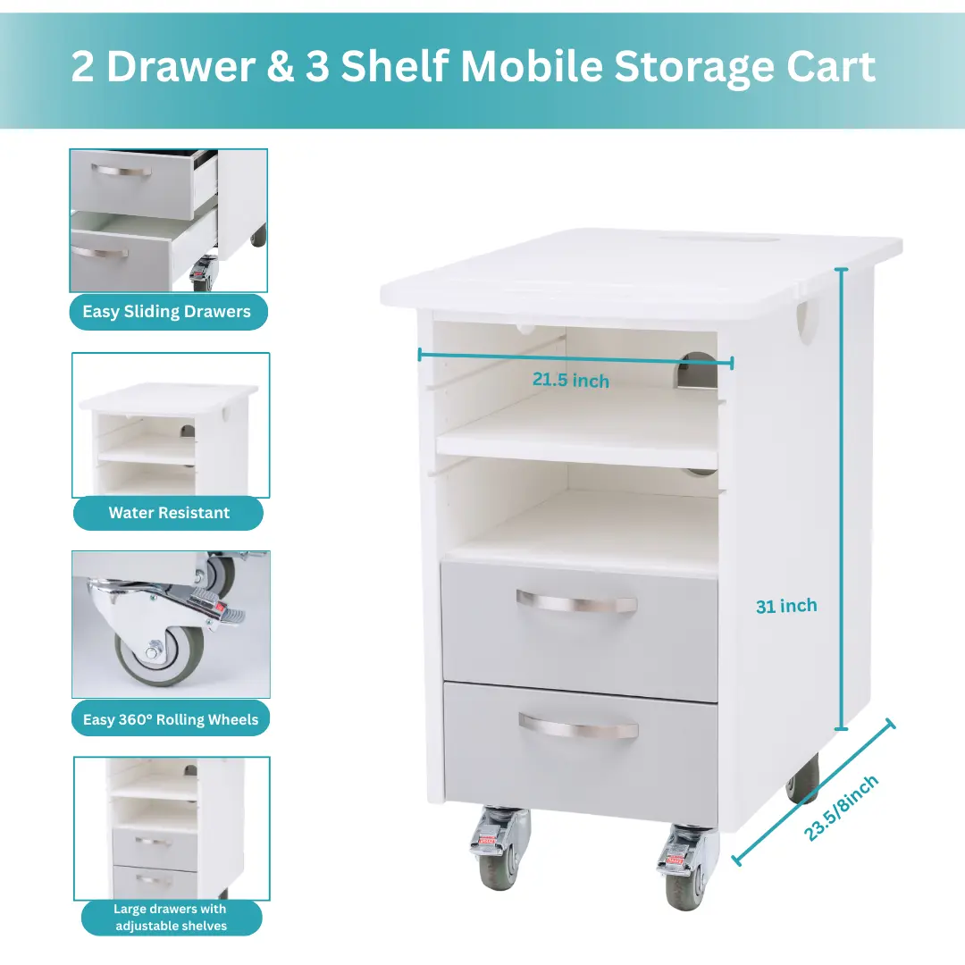 This cart combines versatility, durability, and hygiene in a compact design. With two drawers and three open shelves, it provides both secure storage and easy access to frequently used items. Its sturdy construction, water-resistant surfaces, and antimicrobial protection make it stand out from standard storage carts.