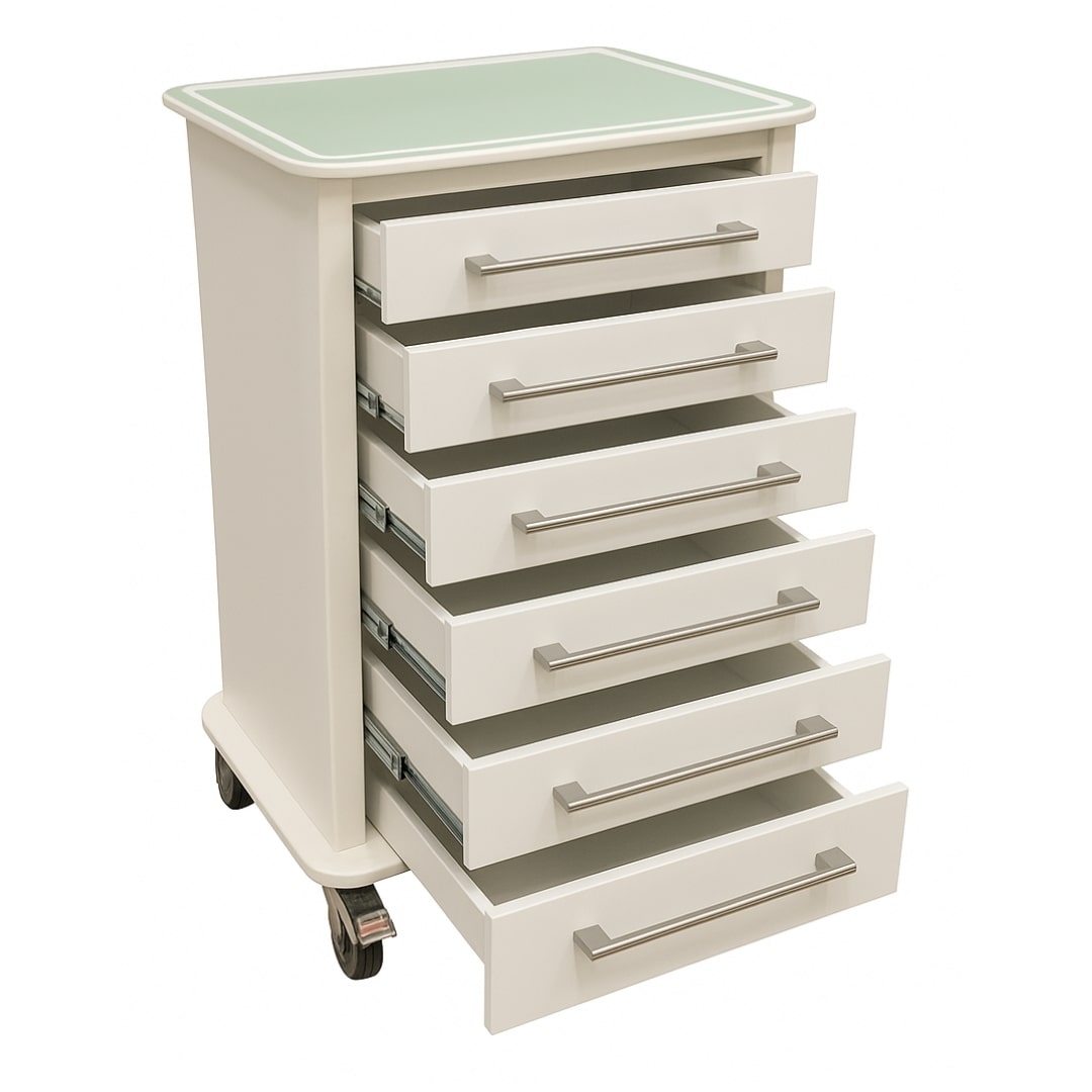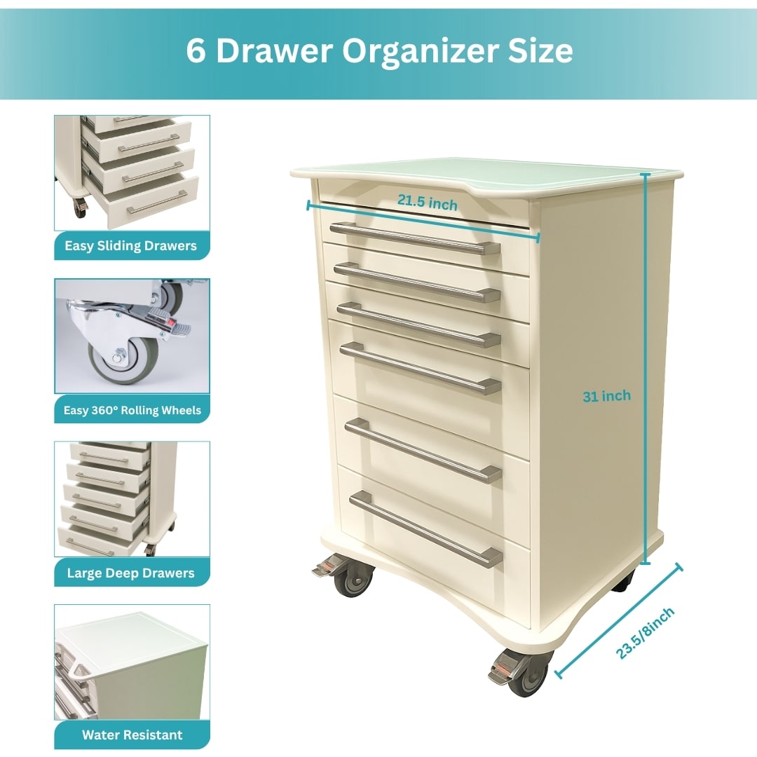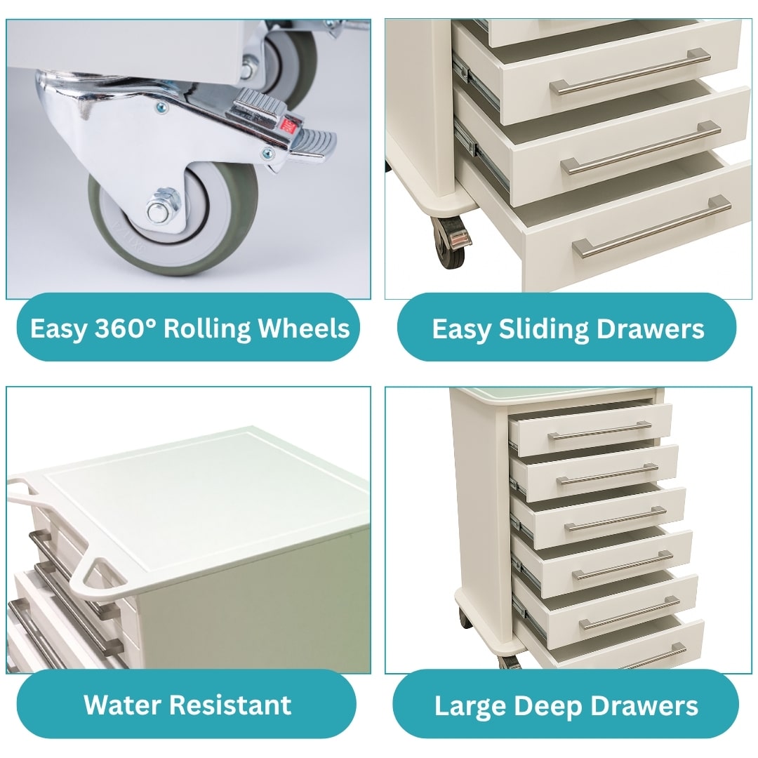 The 6 Drawer Mobile Storage Cart offers robust organization with a sleek, professional design. Crafted from bold materials, it’s built for strength and long-term reliability. Antimicrobial technology and water-resistant surfaces enhance infection control, making it a smart choice for clinics, labs, and offices. Equipped with smooth-glide drawers, it ensures quick, effortless access to supplies while maintaining an organized workspace. Its easy-rolling casters allow seamless movement across any surface, providing efficiency and flexibility where it’s needed most. With six generously sized drawers, this cart balances style, hygiene, and practicality in one mobile solution.