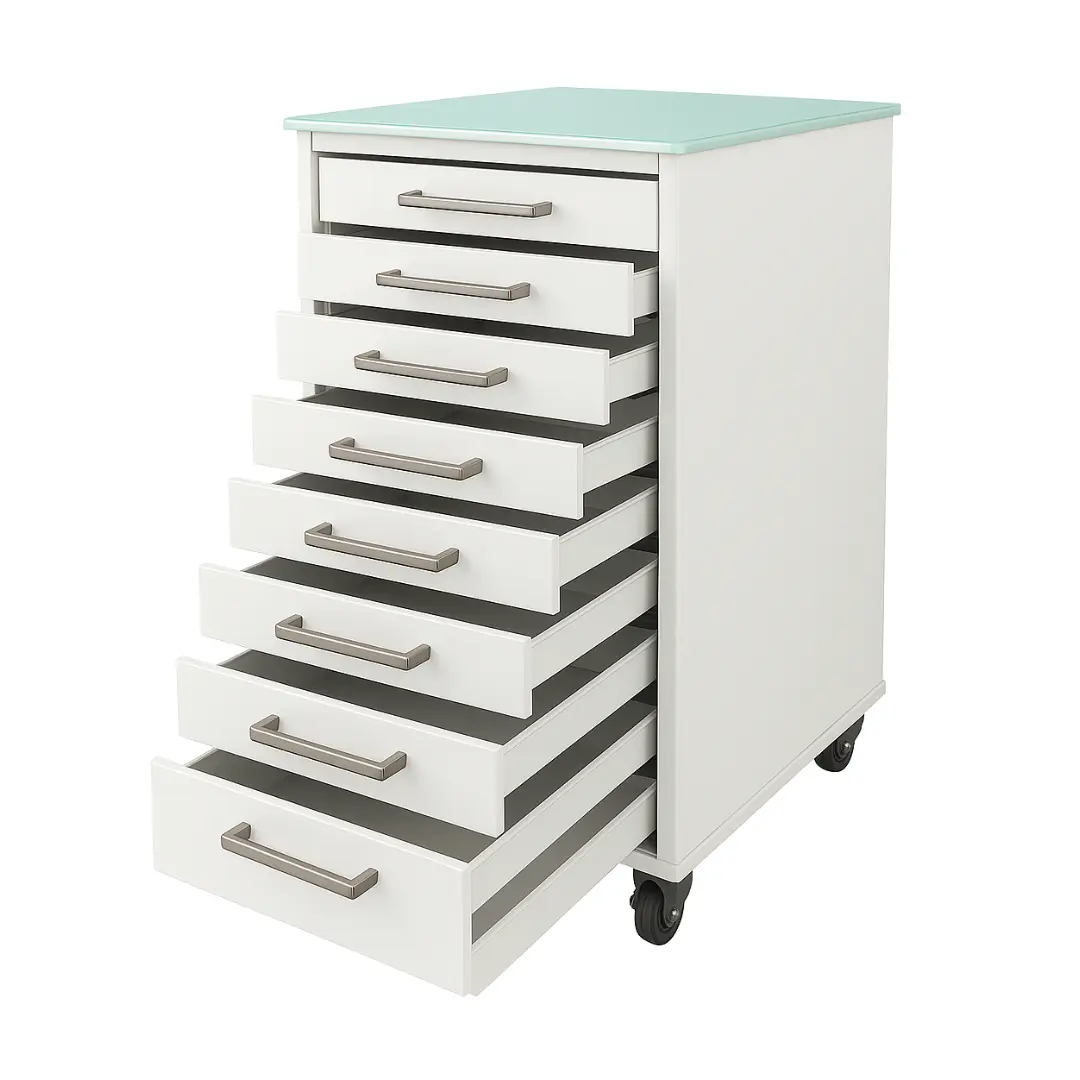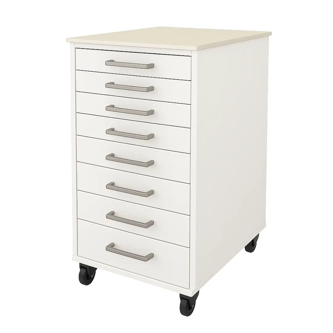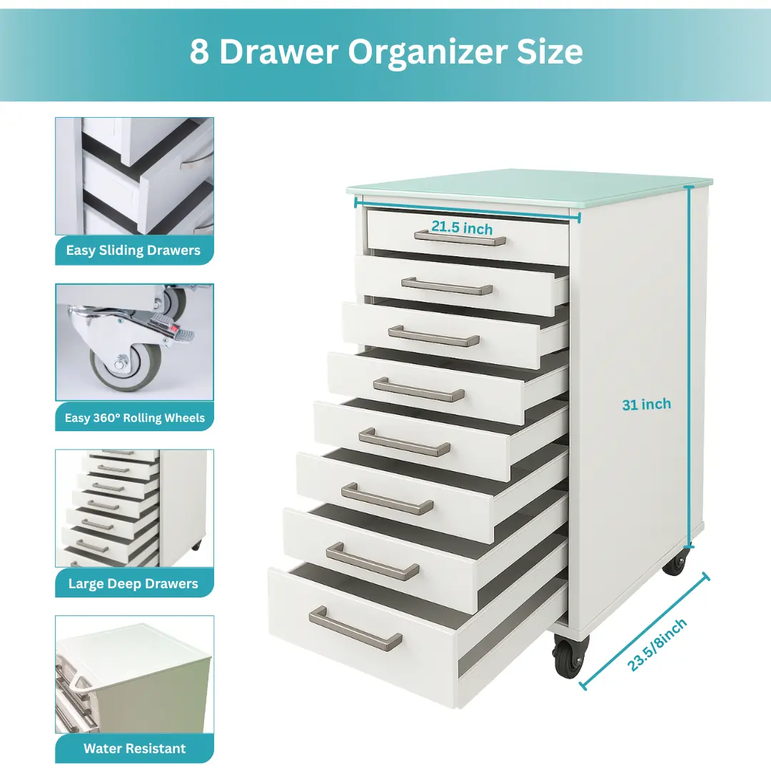 The High-Capacity 8 Drawer Organizer is designed for professional environments that demand both organization and hygiene. Constructed with bold, durable materials, it offers long-lasting strength while incorporating antimicrobial technology for improved infection control. Its water-resistant surfaces simplify cleaning and upkeep, making it a reliable choice for clinics, labs, and offices. With eight smooth-glide drawers, it provides ample space for storing tools, equipment, and supplies. Built with smooth-rolling casters, this unit glides easily across all floor types, ensuring seamless mobility and efficiency in fast-paced workplaces. It’s the perfect balance of capacity, style, and hygiene.
