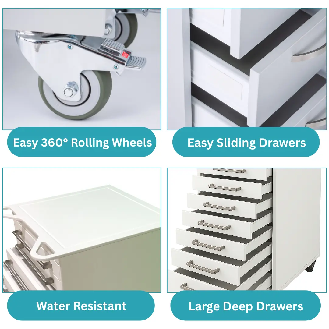 The High-Capacity 8 Drawer Organizer delivers bold durability and antimicrobial protection with water resistance for infection control. Smooth-rolling casters and ample storage make it the ideal mobile solution for clinics, labs, and professional workspaces.